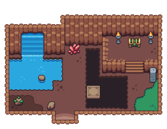 - Cave tileset – Dirt, grass and wall tiles, animated water and waterfall